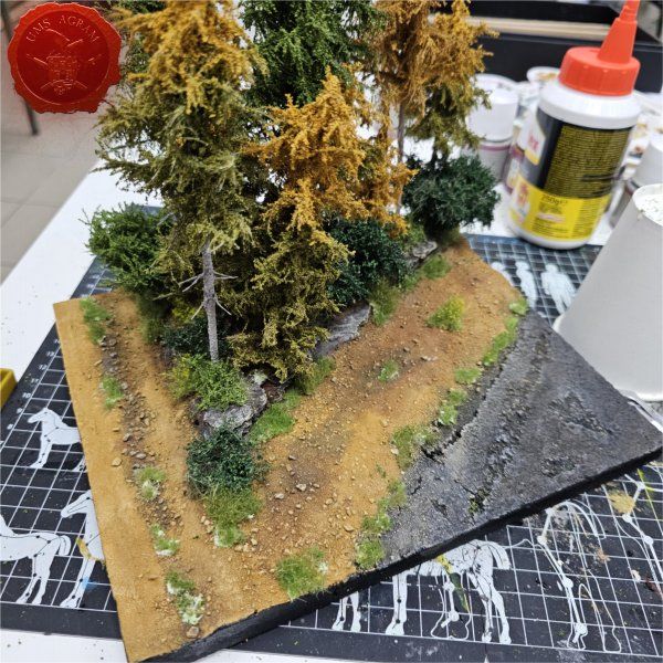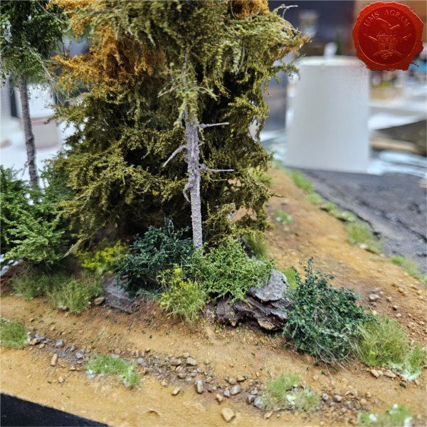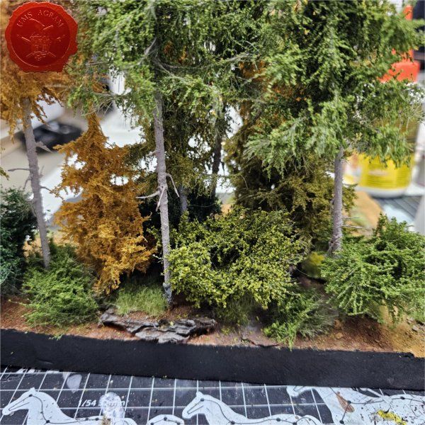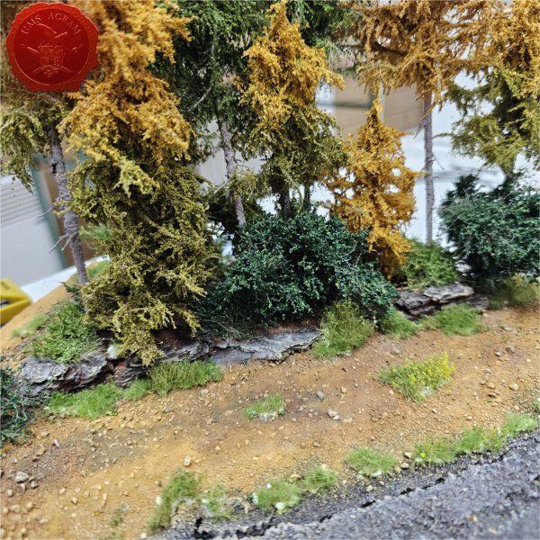 Borovi/drveće je već bilo fiksirano na bazu prije bojanja pa je prva sljedeća vegetacija bila visoko žbunje kojim sam popunio volumen baze.