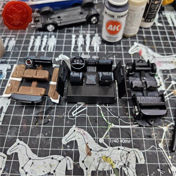 Kako je vidljivo na slici, unutrašnjost vozila je slabo ili nikako obojana stoga je tu otišlo mnogo pažnje i vremena. Tapecirunge sam obojao u sive nijanse, odnosno u smeđe na tristaču. Izvukao sam detalje na komandnim pločama te oko mjenjača.
