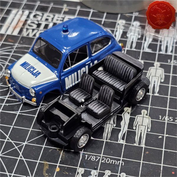 As you can see in the picture, the interior of the vehicle is poorly or not at all painted, so a lot of attention and time was spent there. I painted the upholstery in shades of gray, or brown on the Tristač. I brought out the details on the dashboard and around the gearbox.