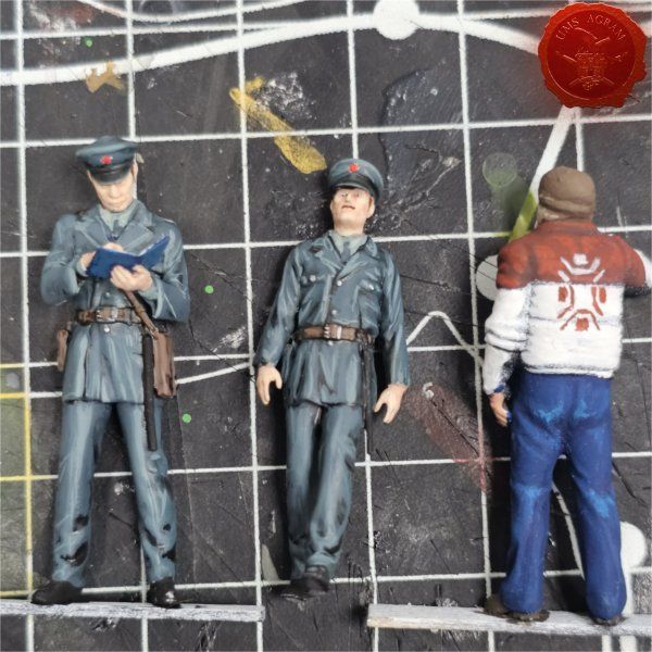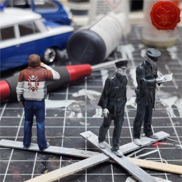 After the base and the vehicles, I started painting the miniatures. Two policemen and a truck driver. The first step was the base color – black and then white..
