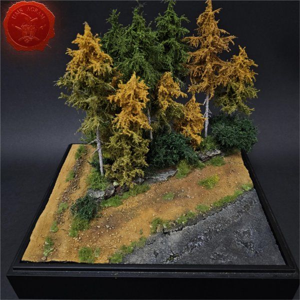 Baza za dioramu je došla s Mosona, od Buce. Fantastičan spoj MDFa i stirodura koji omogućava vađenje same diorame, ali i upuštanje terena ispod razine baze. Izvadio sam stirodurnu podlogu, malo je izmodelirao da dobijem razne razine visine terena. Cestu sam izmodelirao iz ploče pluta, a ostatak terena složio od DAS glinamola i drvenih kora.